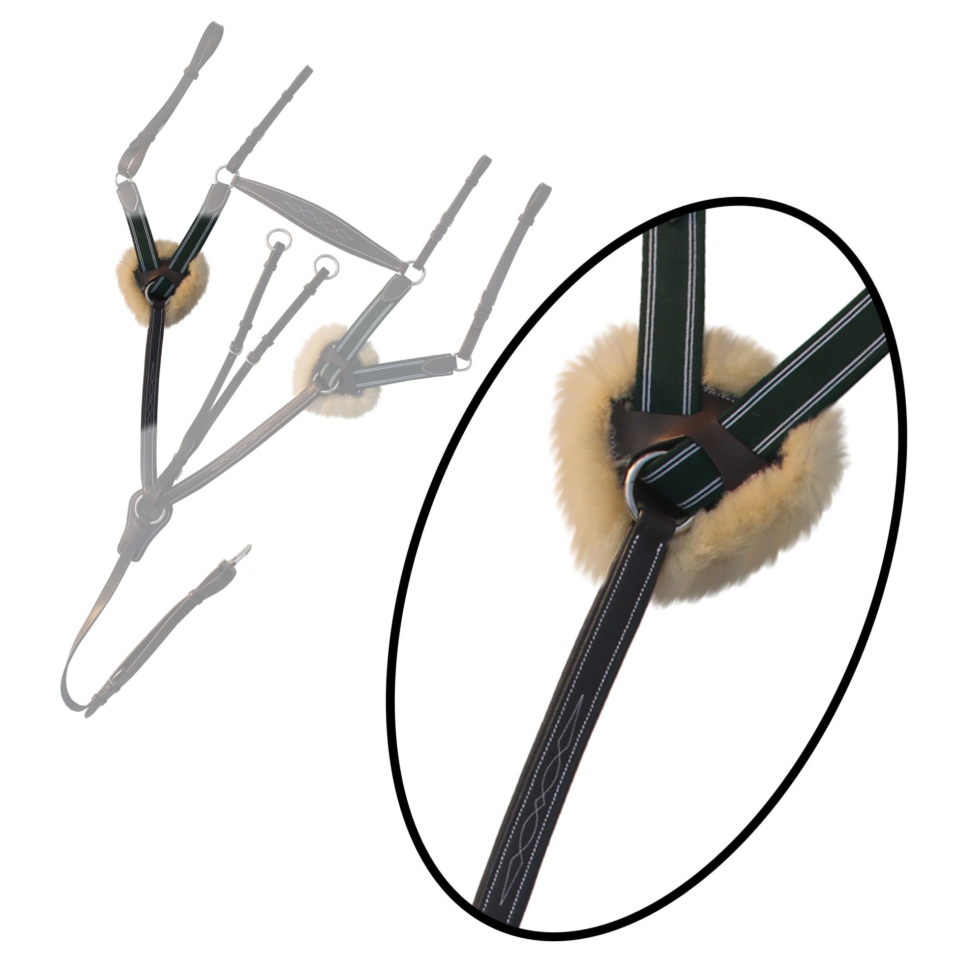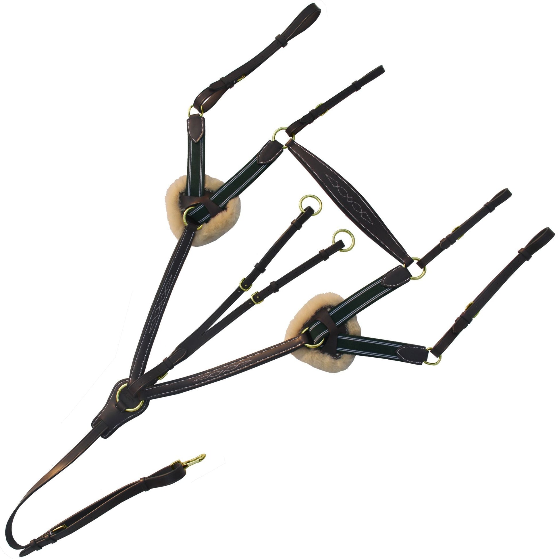 The 5-point design will naturally distribute the pressure over a larger area than a breastplate with just a couple of points of contact. It could also be said that 5-point breastplates don’t put as much pressure on the tree of the saddle when the rider jumps. Use of original Sheep skin and green Elastic and white Lines leather amalgamated inserts at the shoulder.
