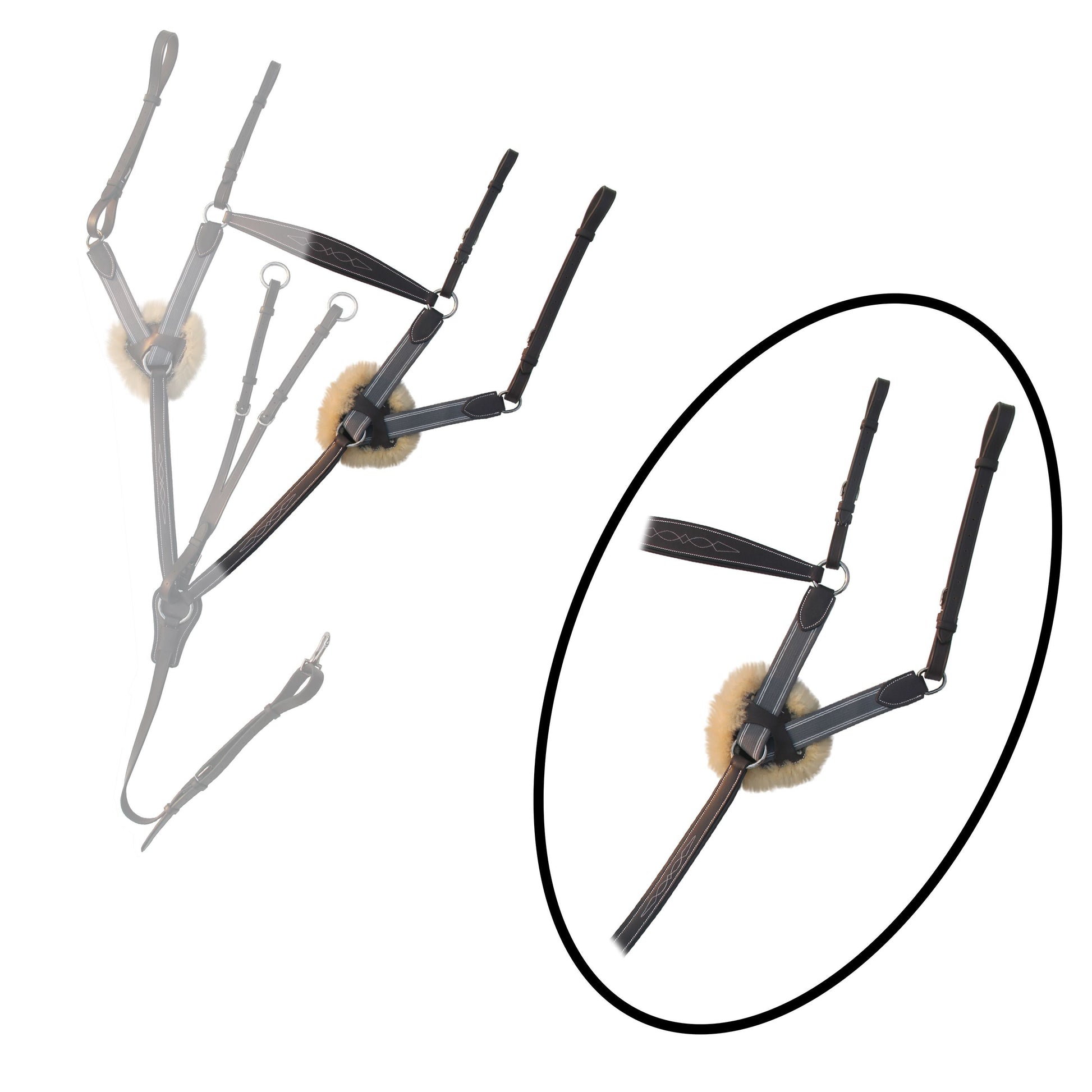 The 5-point design will naturally distribute the pressure over a larger area than a breastplate with just a couple of points of contact. It could also be said that 5-point breastplates don’t put as much pressure on the tree of the saddle when the rider jumps. Use of original Sheep skin and grey Elastic and white Lines leather amalgamated inserts at Shoulder.
