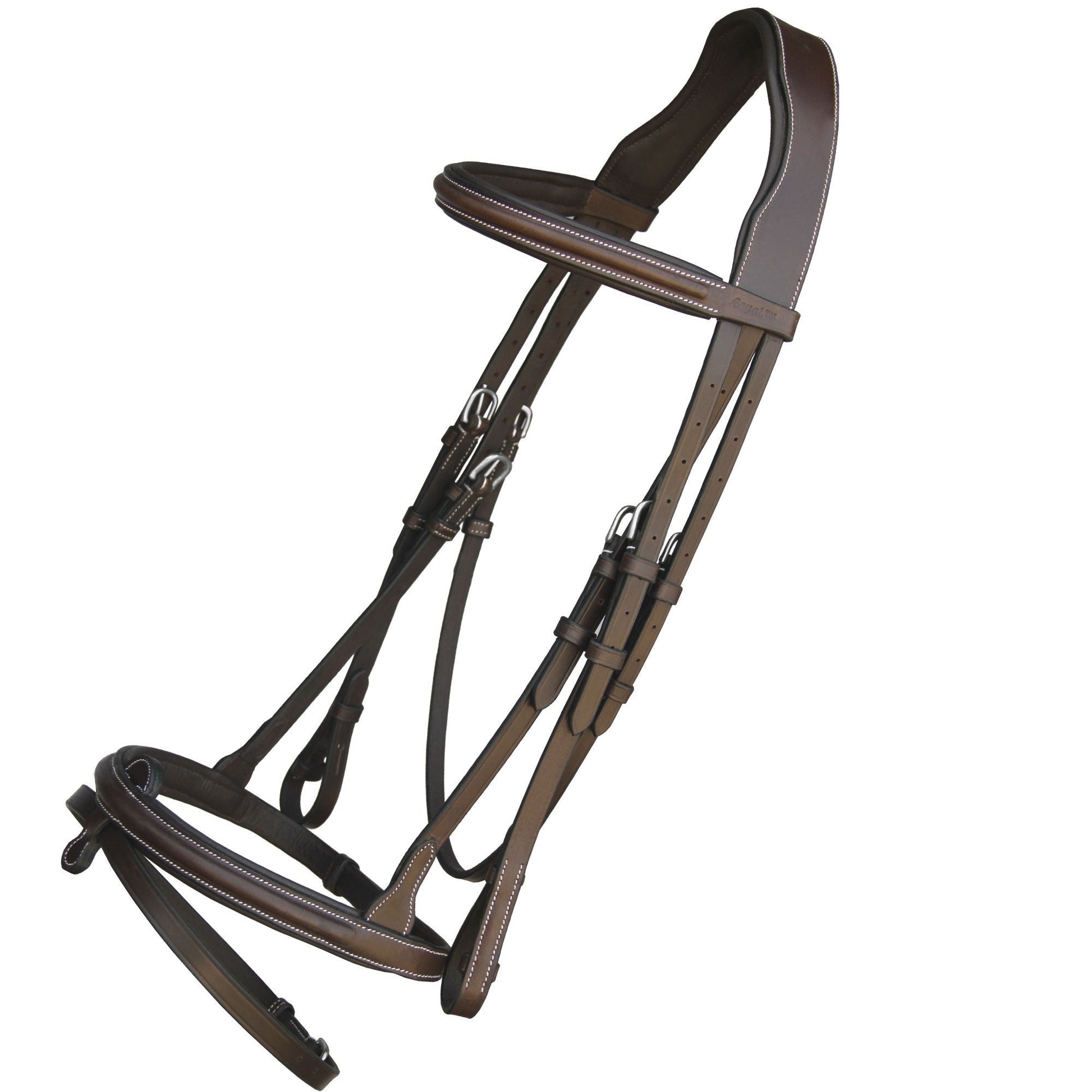 A top-end product with a broad monochromatic crownpiece, anatomically shaped. Extra broad crownpiece releases maximum pressure from the neck of the horse.