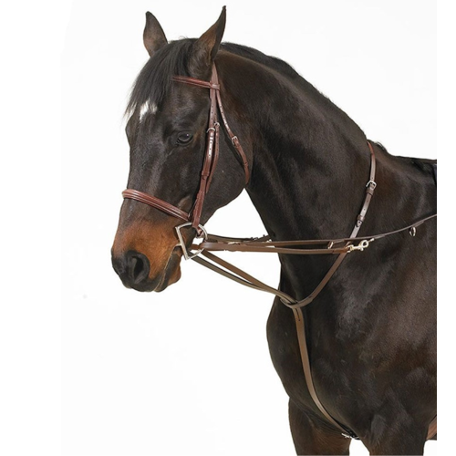 The German Martingale Set is a training aid useful in correcting some types of resistance. The set includes a martingale which has 2 straps with snap ends that run through the bit rings and attach to d rings set at different places along the included reins. By moving the snap, you can give the horse more or less freedom in his head and neck.